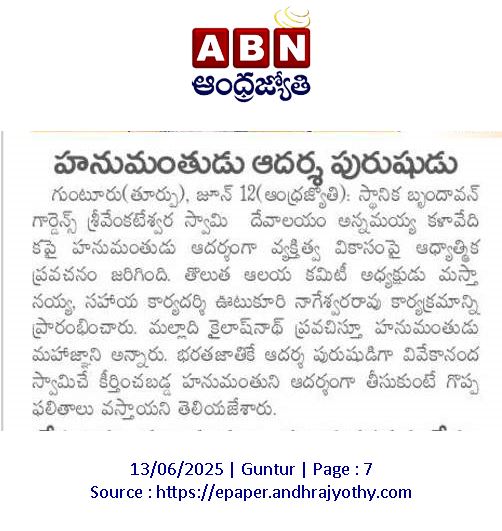 నేటి యువత హనుమంతుడిని ఆదర్శంగా తీసుకోవాలని, తద్వారా యువత విజయం సాధించవచ్చని ప్రవచనకర్త మల్లాది కైలాసనాథ్ అన్నారు. స్థానిక బృందావన్ గార్డెన్స్ శ్రీ వెంకటేశ్వరస్వామి దేవాలయం అన్నమయ్య కళావేదికపై గురువారం ఆధ్యాతి ్మక ప్రవచనం చేశారు. ఆలయ కమిటీ అధ్య క్షులు సీహెచ్.మస్తానయ్య, సహాయ కార్యదర్శి ఊటుకూరి నాగేశ్వరరావు జ్యోతి ప్రజ్వలనతో ప్రారంభించారు. మల్లాది కైలాష్ నాథ్ ప్రసంగిస్తూ హనుమంతుడు మహాజ్ఞాని వీరుడు అని చెప్పారు. శ్రీరామునికి బంటుగా అతనికి మేలు కలగాలని ఉద్దేశంతో అత్యుత్తమంగా పని చేశాడని తెలిపారు.హనుమంతుడి హృద యపూర్వకమైన భక్తిని అందరం ఆదర్శంగా తీసుకోవాలని ఆయన సూచించారు.